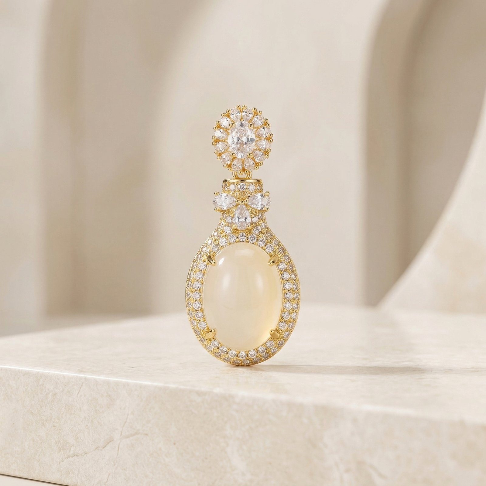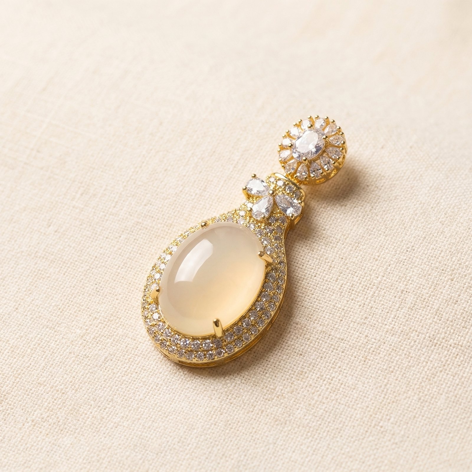 Ivory Grace Jade Pendant is an elegant oval pendant designed with a soft ivory-toned centerpiece and a refined halo-style setting. Surrounded by delicate sparkling accents and finished in a warm gold-tone frame, this piece offers a graceful look suitable for gifting, occasion wear, and elevated everyday styling.