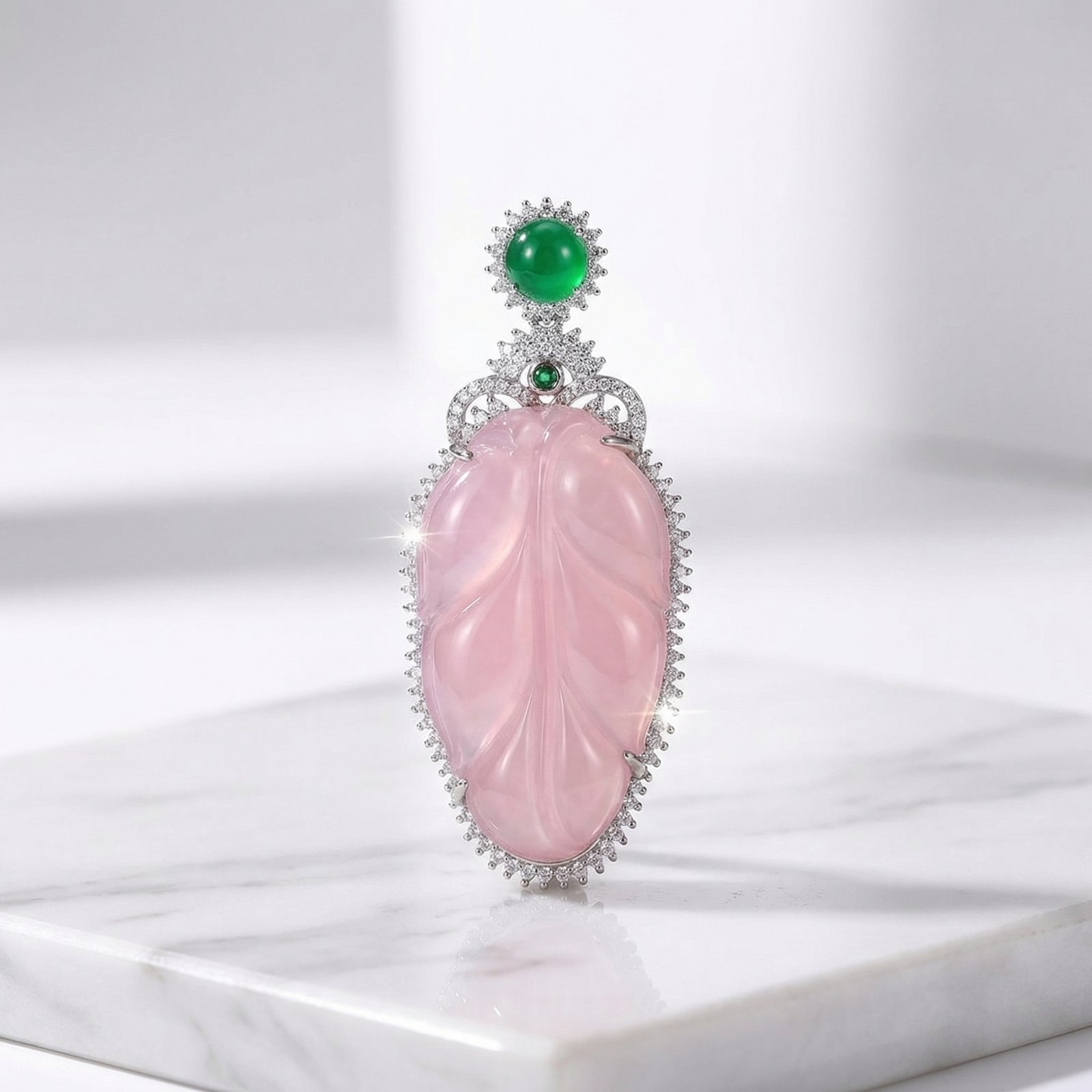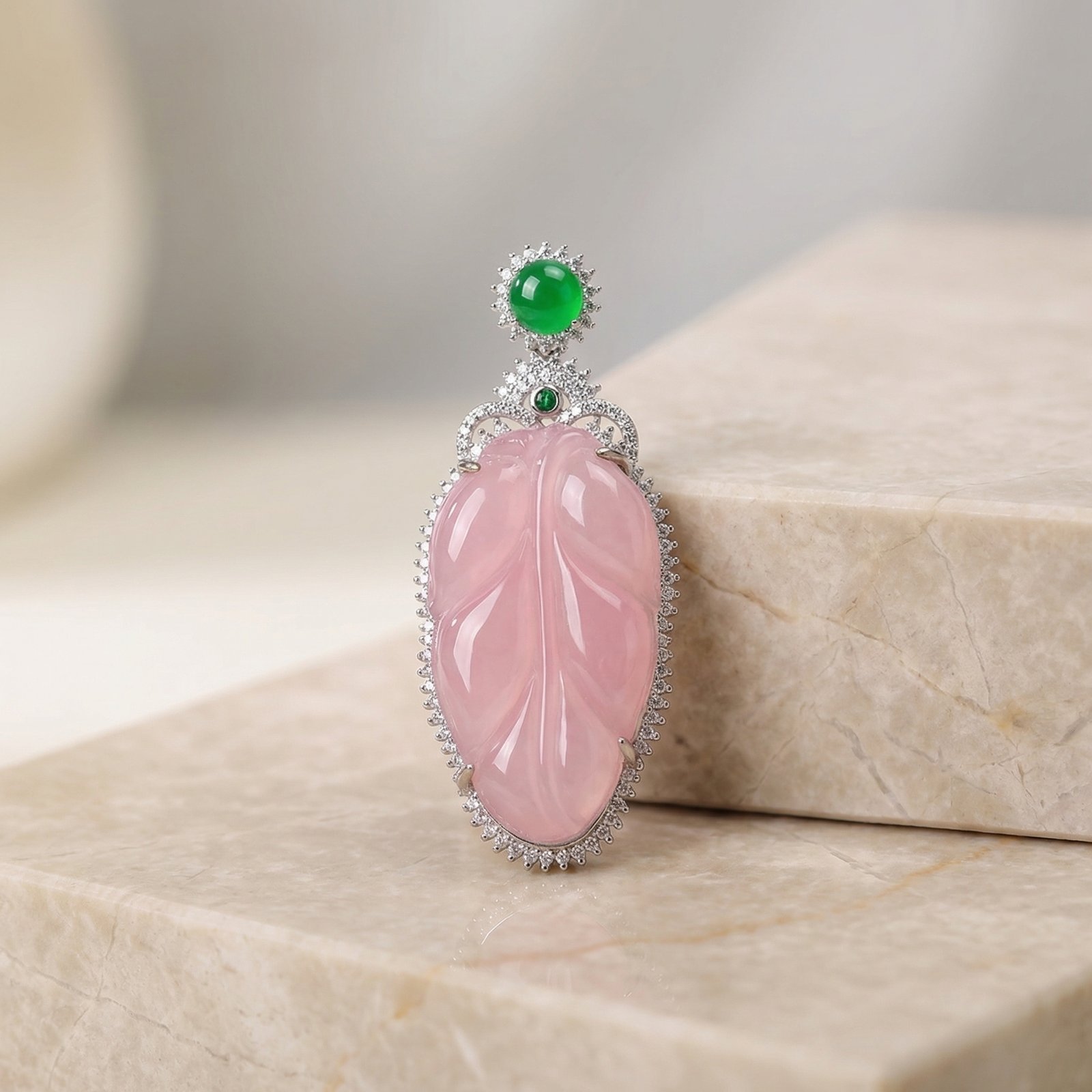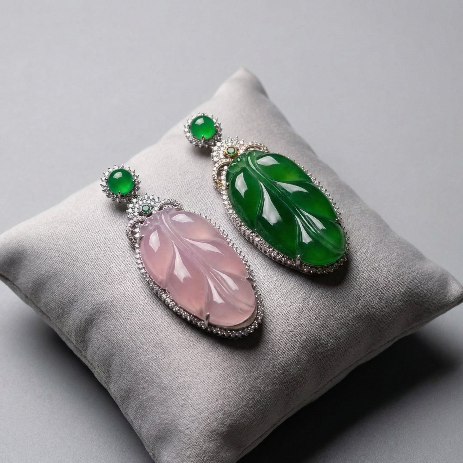 Leaf Jade Drop Earring is a statement single earring designed with a carved leaf-inspired jade element, refined halo-style detailing, and an elegant drop silhouette. Available in soft pink or vivid green, this design combines decorative craftsmanship with a graceful and polished presentation.